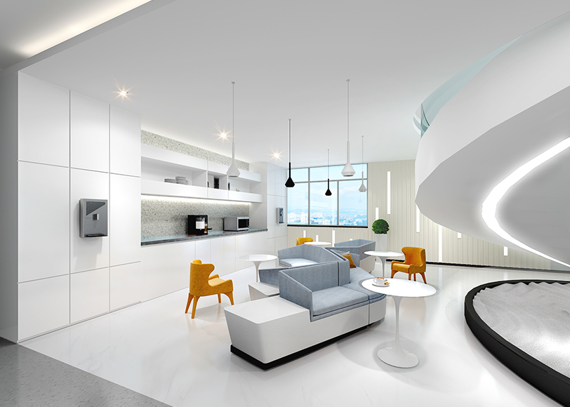 4、門廳接待處背景墻設計采用真實植物進行裝飾,構成生態的室內空間,提升空間使用的舒適度。辦公室前臺的設計運用體塊切割的方式做成不規則的形狀,以到達從不同的角度觀看到的場景都處于變化的狀態當中。茶水區,同時也是為員工準備的小型餐廳,水泥質感的休閑餐飲空間更加穩重大方,吧臺的設計可為員工提供輕食的烹飪,以及簡食的加熱。