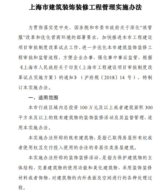 上海市辦公室裝修工程分為一般類裝修工程和特殊類裝修工程兩類。按照分類實行差別化管理、分類審批。一次申報多個建筑單體或者部位實施裝飾裝修,凡有一個及以上建筑單體或部位涉及特殊類裝修內容,該裝飾裝修工程按照特殊類裝修工程進行審批。