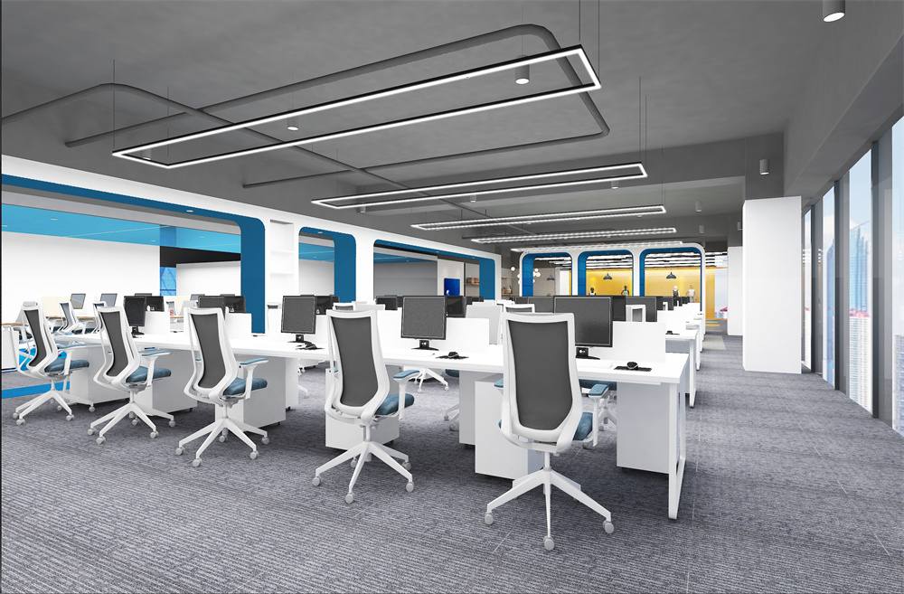 開方式辦公區員工常規比較密集,經常有員工反映“燈下黑”的現象,所以在敞開辦公區燈光設計時建議選擇多方位,多角度燈光設計,提倡無主燈概念,區別于以往傳統只靠一盞主燈完成整個空間照明功能的一種設計方式,采用用不同燈具搭配,利用分區組合的方式完成空間照明功能的方式。避免了強光直射的不適感,視覺上更具美感,在空間劃分上,也起到一定視覺輔助作用。既解決了“燈下黑”的照明弊端,在視覺上又不會分隔空間,并不會因此顯得雜亂無章,給人以壓抑感。
