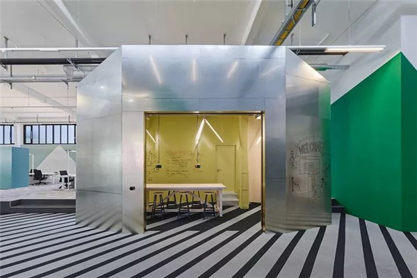 4、創(chuàng)意工業(yè)風(fēng)汽車公司辦公室裝修設(shè)計:室內(nèi)材質(zhì)的選擇遵從于汽車產(chǎn)業(yè)的工業(yè)屬性。未加工鋅板、天然木材和鋼材表面共同構(gòu)筑室內(nèi)幾何單元。有著半通透質(zhì)感的聚碳酸酯材料板構(gòu)筑了室內(nèi)眾多隔間墻體。聚碳酸酯與原木框架的結(jié)合,讓這里呈現(xiàn)出建筑構(gòu)造較初始的發(fā)展?fàn)顟B(tài)中。初始化工業(yè)風(fēng)質(zhì)感在強(qiáng)烈的色彩映襯下和時尚的家具點(diǎn)綴下,形成鮮明的質(zhì)感對比,帶來豐富的空間體驗(yàn)。近似黑白對比的條紋地毯,在空間中不斷演繹著微妙的圖形變化,帶來精彩而時尚的視覺驚艷。